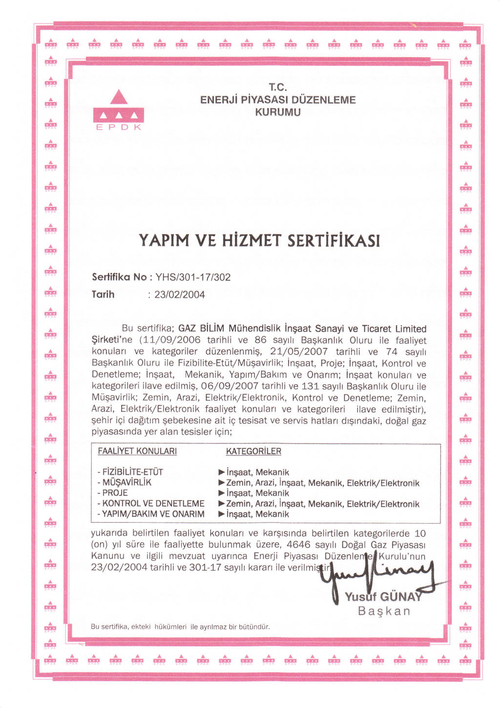 EPDK Yapım ve Hizmet Sertifikası